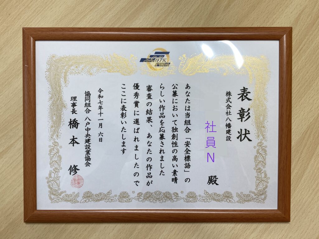 安全スローガン優秀賞🏆 投稿日 2025年11月25日 著者 s_furumagi カテゴリー 社内 11月6日に行われた安全衛生推進大会にて、 弊社の職員が表彰されました🌈 協同組合 八戸中央建設業協会さんで安全スローガンを募集しており、 多数応募の中から弊社社員のNが選ばれ、優秀賞を受賞しました。 【空気から 変えていこうよ 安全を 誰かじゃなくて みんなの責務】 ↑が応募したスローガンです。 ↑表彰状です👏 congratulations‼